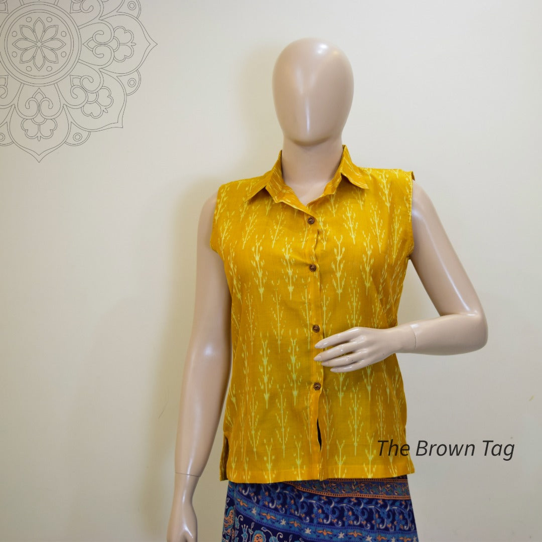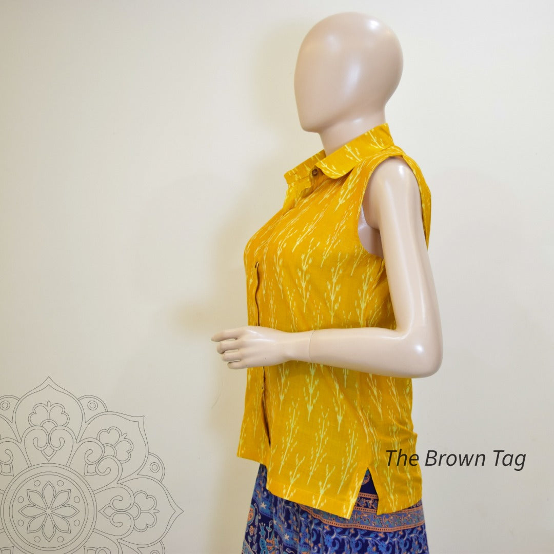 Material - Yellow and white mercerized cotton ikat fabric by the yard. It is medium weight yarn dyed fabric. This handloom ikkat sleeveless top comes with a collar and buttons in the front. sleeves are provided separately.