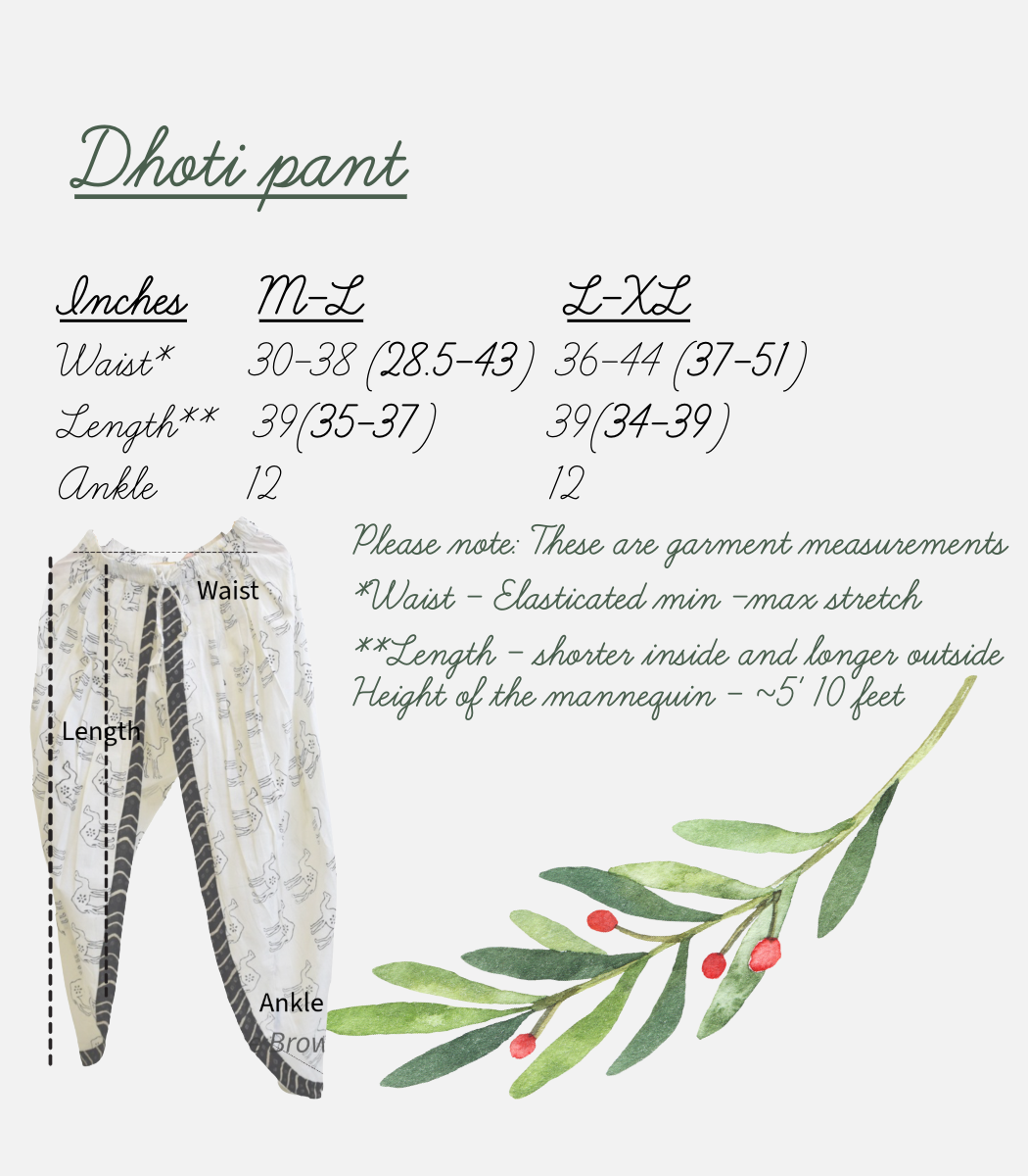 Material - Cotton, light weight fabric. Pants come with a fine contrast lining and full length. Elasticated to provide a range of stretch around the waist. Please see the size guide to know more.