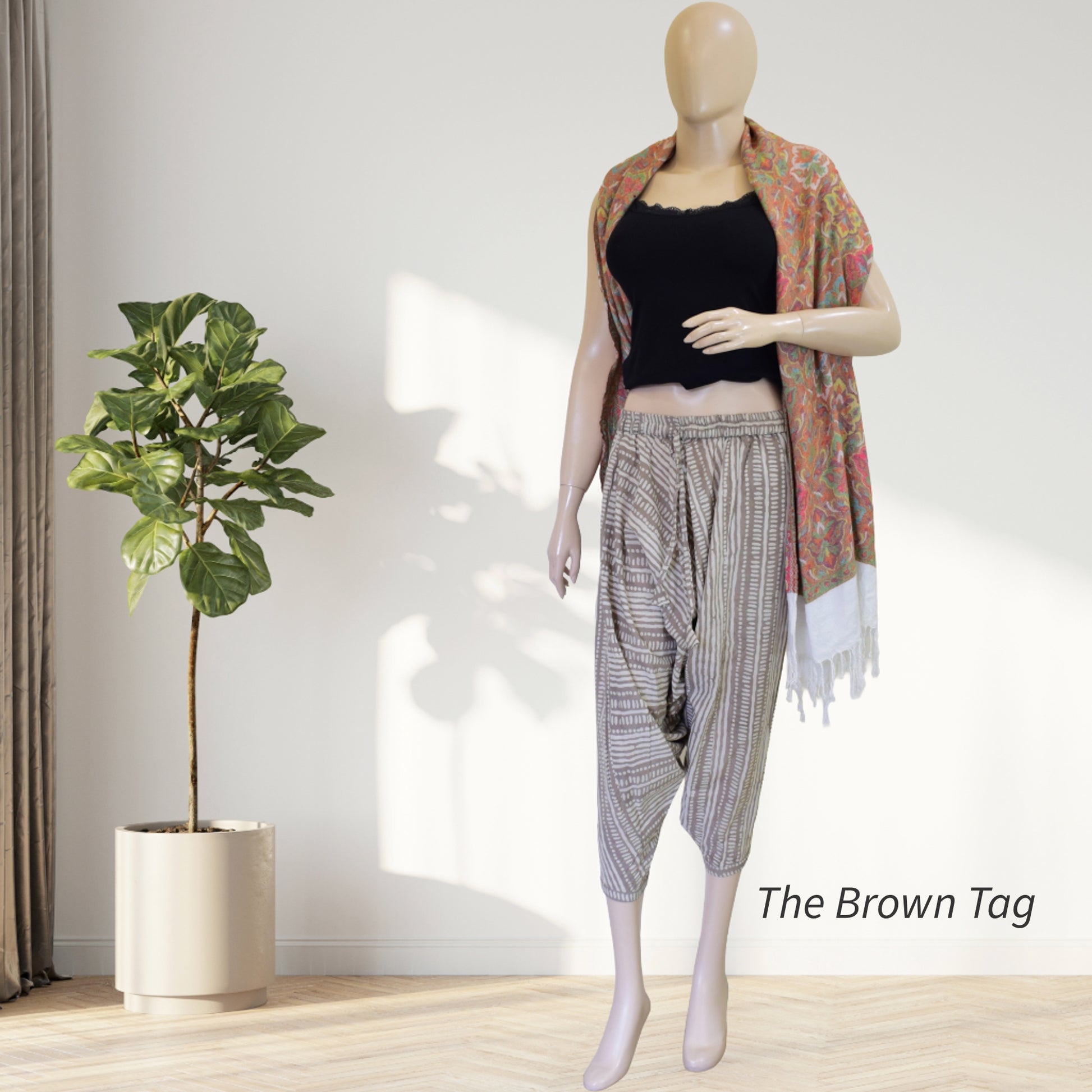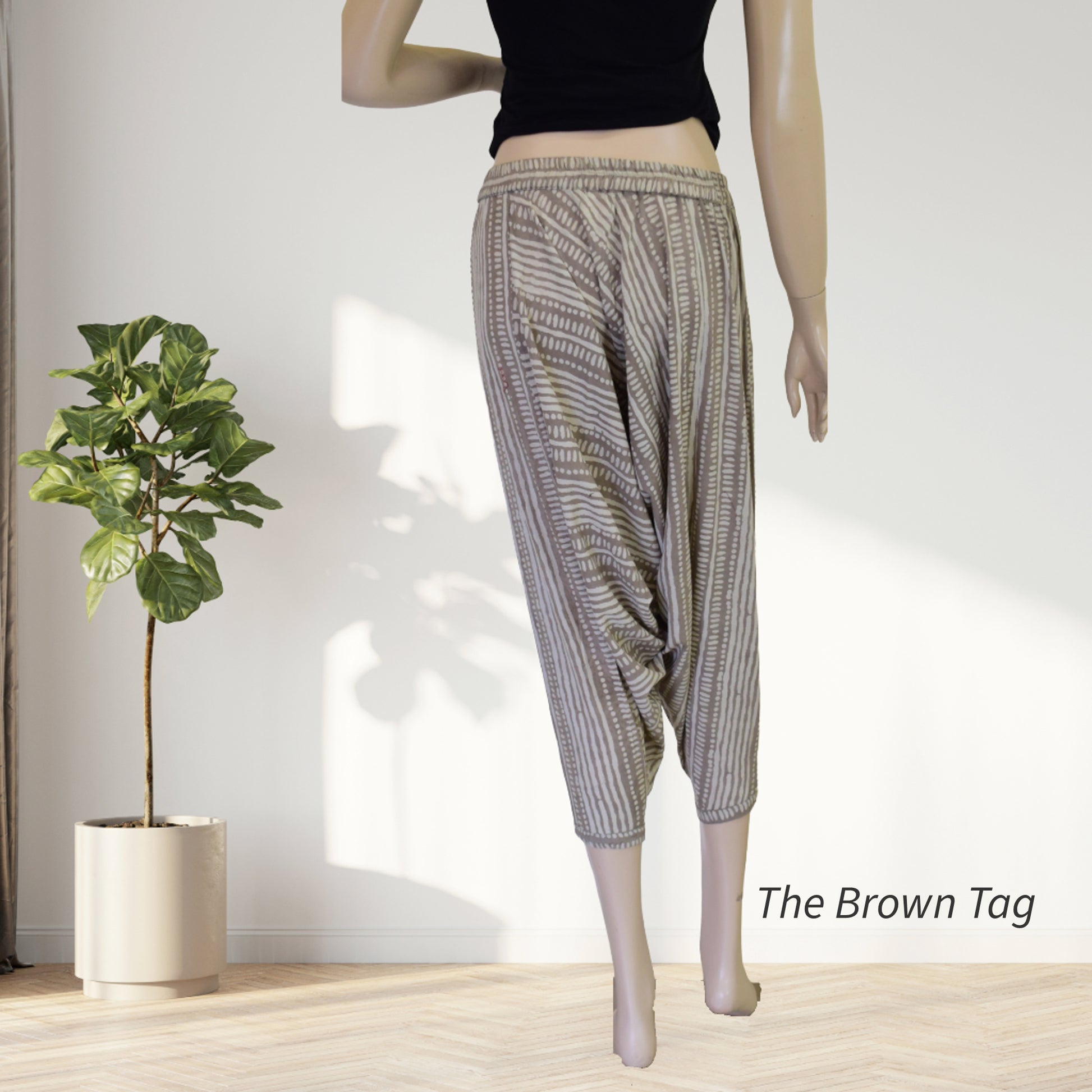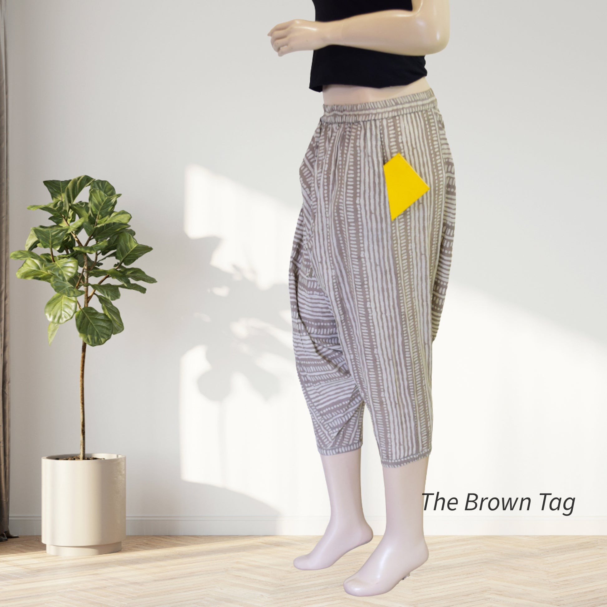 Material - cotton light weight fabric. Calf length (3/4th) loose pants to easily accommodate your stretch. Elasticated to provide a range of stretch around the waist and calf. These come with a pocket on the side. Please see the size guide to know more.