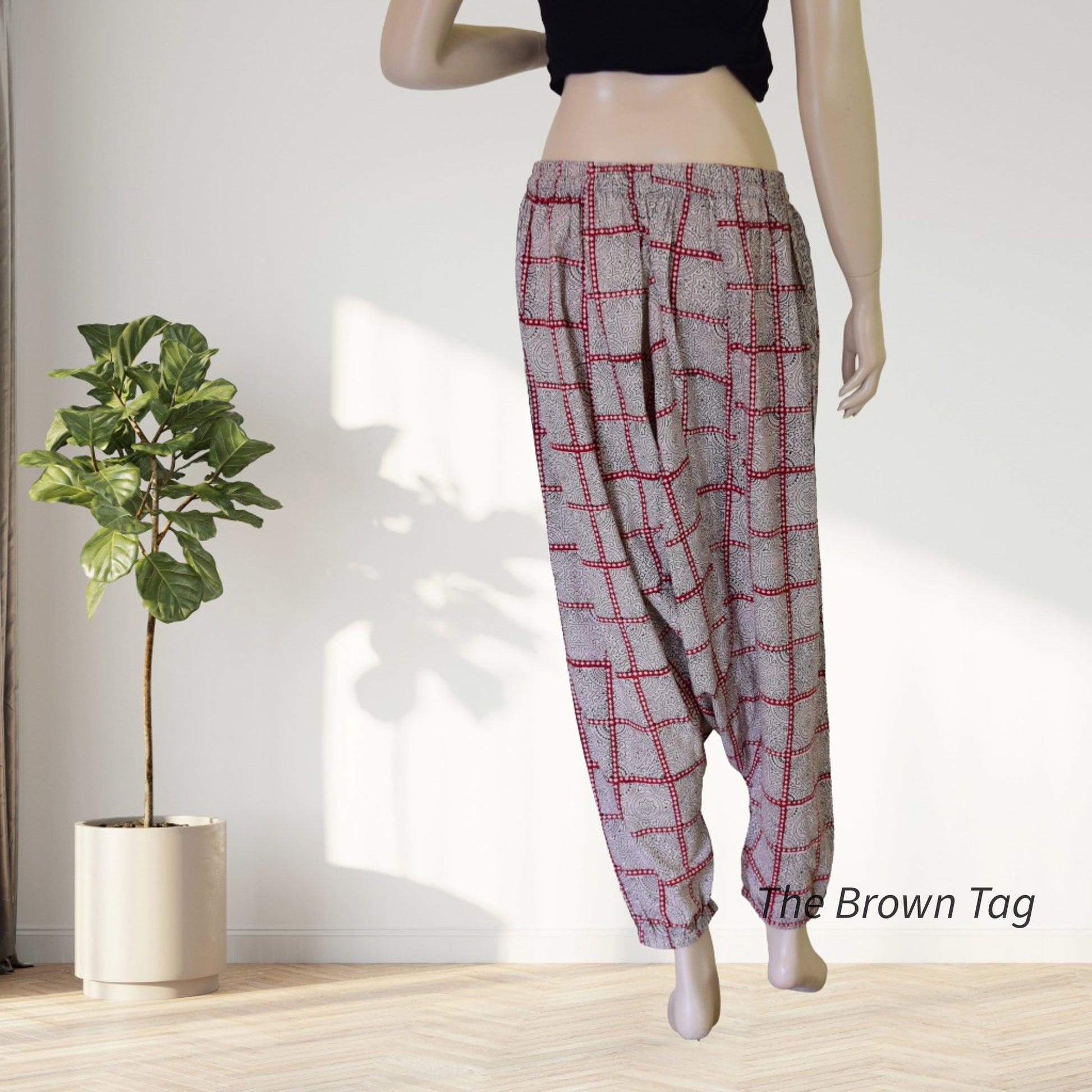 Material - Cotton, medium/light weight fabric. Ankle length loose pants to easily accommodate your stretch. Elasticated to provide a range of stretch around the waist and ankle. These come with a pocket on the side. Please see the size guide to know more