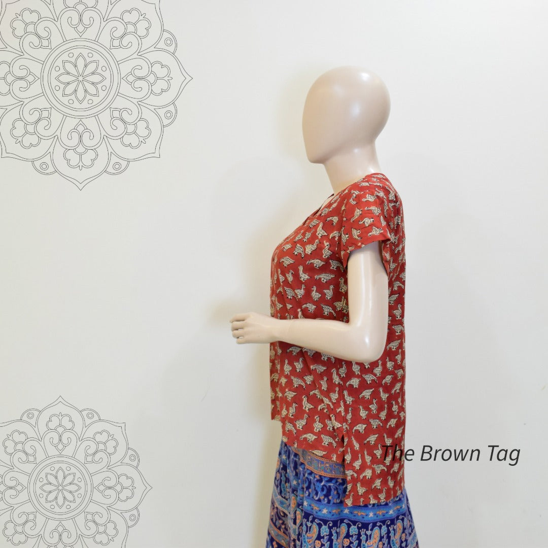 Material - Cotton, medium weight fabric. The kurthi has short hands with a longer back length and a shorter front length.